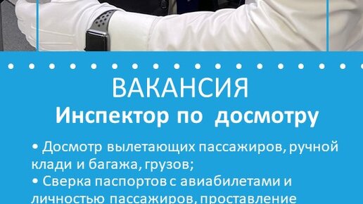 Друзья! Мы ищем будущих инспекторов по досмотру✈ #вакансияаэропортсочи Ваша задача: 🔹Производить досмотр вылетающих пассажиров, ручной клади и багажа, грузов, членов экипажей и наземного персонала, воздушных судов. 🔹Производить сверку паспортов с авиабилетами и личностью пассажиров, отмечать посадочные талоны с проставлением штампа о прохождении специального контроля Требования к вакансии: 🔸Образование среднее профессиональное, высшее. 🔸Ответственность, стрессоустойчивость, быстрая обучаемость, дисциплинированность, коммуникабельность...