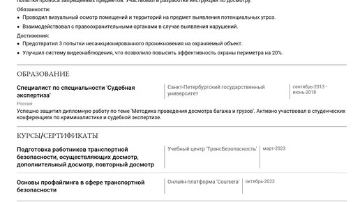 Изучение готовых примеров — это лучший способ понять, как составить по-настоящему эффективное резюме. Наш пример резюме инспектора по досмотру покажет вам, как представить свой опыт и навыки, чтобы получить приглашение на собеседование. В этой статье вы найдете подробное руководство, охватывающее все этапы создания резюме инспектора по досмотру для любого уровня опыта. Мы дадим пошаговые инструкции по каждому разделу, учитывая актуальные требования работодателей и ключевые навыки для этой профессии...