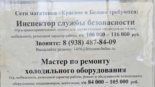 Здравствуйте, уважаемые подписчики и гости моего канала! Проходя мимо магазина "Красное и Белое" я обратил внимание на объявление, в котором было указано следующее: Сети магазинов "Красное и Белое" требуется инспектор службы безопасности