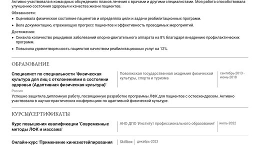 Пример резюме инструктора по лечебной физкультуре 2025 - Как составить