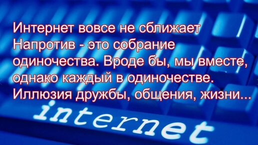 Мысли вслух В современном мире технологий и глобализации Интернет стал огромной частью теперешней жизни. Мы подолгу находимся онлайн, общаемся в соц. сетях, делимся впечатлениями в блогах, но насколько это реальное общение, насколько настоящие наши дружбы в виртуальном мире, и насколько "машина" создает иллюзию жизни? Да, интернет - возможности для общения. Мы легко поддерживаем связь с друзьями и родственниками даже на огромном расстоянии, общаемся с людьми в разных уголках мира, находим единомышленников по интересам...