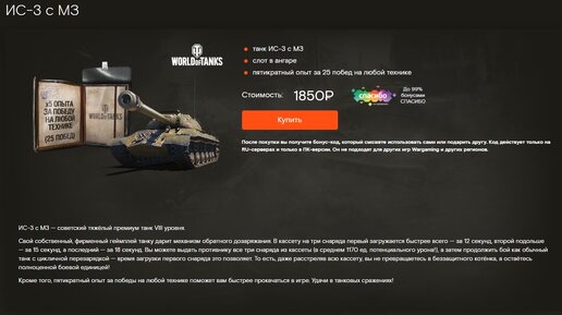 На оф. Сайте Спасибо РТ эксклюзивно завезли в продажу ограниченную партию танков ИС-3 с МЗ (🌍СССР, ТТ-8 прем. Механизм обратной дозарядки на 3 снаряда). До этого раза данный танк продавался всего 2 раза и оба раза не менее чем за 2740 рублей в наборе у WG...