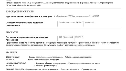 Наш пример резюме кондуктора поможет вам понять, как составить сильное и эффективное резюме. Изучение готовых примеров — это прямой путь к получению желаемой работы. В этом руководстве вы найдете не только готовые примеры резюме кондуктора для разных уровней опыта, но и пошаговые инструкции по каждому разделу. Мы подробно разберем . Этот материал полезен как для начинающих, так и для опытных специалистов. Изучив пример, вы сможете создать резюме с помощью нашего конструктора резюме 🛠️. Заголовок резюме – это первое, что видит работодатель...