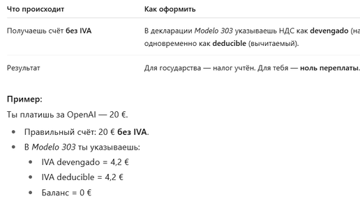 Ты открыл своё дело в Испании (como autónomo или empresa) и оплатил сервис вроде OpenAI, AWS, Notion, Canva или Zoom. И вдруг — в счёте стоит IVA 21 %, хотя компания вообще-то из США. 👉 На самом деле, в 90 % случаев они не должны были брать с тебя IVA. Если ты — предприниматель, то действует особое правило: inversión del sujeto pasivo (инверсия налогоплательщика). 📘 Закон: Artículo 84 de la Ley 37/1992 del IVA (Ley del Impuesto sobre el Valor Añadido). Согласно ему, когда предприниматель в Испании покупает услуги у компании вне ЕС, налог не платит поставщик, а сам клиент (т...