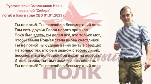 Смолянинов Иван2 года назадПодписатьсяРусский воин Смолянинов Иван позывной "Сибирь" погиб в бою в ходе СВО 01.01.2023 г. «Ты не погиб! Ты перешёл в Бессмертный полк»