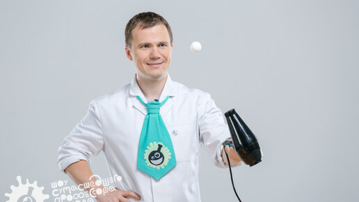 Фен и шарики Что будет, если взять шарик и подбросить его в воздух? Он, конечно же, упадет. А можно ли сделать так, чтобы он «повис» в воздухе? Нам потребуется: - фен; - шарик для настольного тенниса; - воздушный шарик. Что делаем: - для начала надуем воздушный шарик и завяжем его так, чтобы воздух из него не выходил; - включим фен и поместим в поток воздуха шарик, он улетел!!! Почему? Очень уж он легкий, а наш фен слишком мощный; - теперь пришло время для шариков для настольного тенниса, также включим...