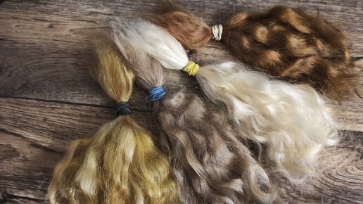 Чтобы волосы у куклы выглядели натурально, лучше всего использовать козий пух ( шерсть козы без подшерстка). Вот такие локоны я покупаю. Они ещё не мытые и не вычесаны. Можно так же купить шкурку пуховой козы. Прежде чем сделать волосы кукле необходимо помыть эти локоны и хорошо вычесать весь осетевой волос, он короче пуха и жёсткий...