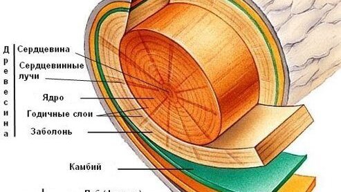 На распиле ствола хорошо видны сердцевина, заболонь (древесина), камбий и кора. При окорке ствол очищается от внешней части коры, а также слоев пробки и луба. Камбий занимает промежуточное положение между древесиной и корой...