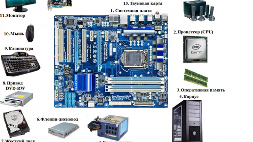 Устройство компьютера. Из чего состоит компьютер? Компьютер состоит из системного блока, монитора, клавиатуры, мышки, аудиосистемы. К нему можно подключить геймпад, принтер, сканер и много других устройств. Основные устройства компьютера «живут» в системном блоке. К ним относятся: материнская плата, процессор, видеокарта, оперативная память, жесткий диск. Но за его пределами, обычно на столе, «проживают» также не менее важные устройства компьютера. Такие как: монитор, мышь, клавиатура, колонки, принтер...