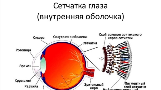 Сетчатка глаза — это многослойная структура, которая состоит из различных по своим функциям слоёв клеток. Зрительная часть сетчатки — прозрачная, тонкая, мягкая (но не эластичная) ткань, имеющая сетчатое строение. Наружная часть сетчатки прилежит к хориоидее, а внутренняя — к стекловидному телу. Почти на всём протяжении сетчатка удерживается на месте благодаря давлению стекловидного тела. Именно сетчатка отвечает за дневное, ночное и сумеречное зрение, а также обеспечивает центральное и периферическое зрение...