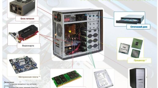 Системный блок – это блок, внутри которого находятся основные комплектующие компьютера. Он состоит из корпуса, блока питания, материнской платы, процессора, оперативной памяти, видеокарты, жесткого диска, опционально дивидирома (DVD-ROM)...