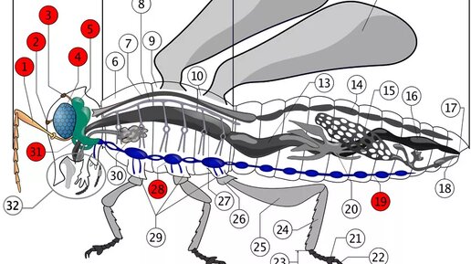 Вы когда-нибудь задумывались о том, как выглядит насекомое внутри? Или у насекомого есть сердце или мозг? Тело насекомого - это урок простоты. Три части кишечника расщепляют пищу и поглощают все питательные вещества, необходимые насекомым. Один сосуд перекачивает и направляет поток крови. Нервы объединяются в различные ганглии для управления движением, зрением, едой и функциями органов. На этой схеме изображено общее насекомое и показаны основные внутренние органы и структуры, которые позволяют насекомому жить и адаптироваться к окружающей среде...