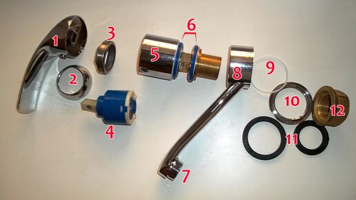 Всё об однорычажном смесителе В этот раз мы разберем, из каких основных частей состоит однорычажный смеситель на раковину. Рассмотрим основные поломки и детали, которые при этом следует заменить. Проблемы со смесителем: 1 - течет вода из под рычага смесителя, капает с излива (с носика крана), рычаг скрипит и трудно поворачивается. Решение – заменить картридж № 4 на фото 2 - течёт вода над и под носиком излива. Решение – заменить уплотнительные манжеты № 6 на фото, или подмотать под их посадочные места фумленту для восстановления плотности прилегания...