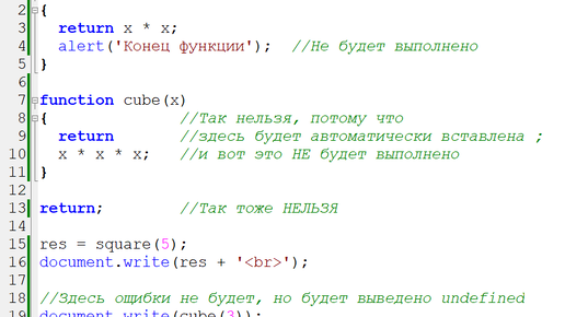 Функция обычно возвращает какое-то значение. В JavaScript для того, чтобы функция вернула значение, недостаточно просто написать её имя в исходном коде, надо ещё использовать оператор вызова функции (впрочем, это особенность не только этого языка). Ну и непосредственно в теле функции должна быть инструкция return Синтаксис: return выражение; Инструкция return может располагаться только в теле функции. Присутствие её в любом другом месте является синтаксической ошибкой. Когда выполняется инструкция...