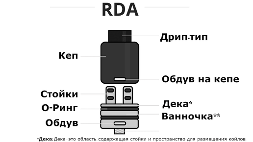 Атом или атомайзер одна из главных частей электронной сигареты, с помощью которой жидкость для курения преобразуется в пар. Тушка или мод — устройство на которое накручивается атомайзер. Сегодня будет разговор именно об атомах. У всех атомах есть одно это: 510 резьба(у мода принимающая 510) а также койл (от англ. coil – катушка, спираль) – часть устройства, которую также часто называют, просто «испаритель», «испарик», «катушка», «намотка», или как-нибудь ещё. Первый и самый простой это дрипка или RDA (rebuildable dripping atomiser), представляет собой обслуживаемый атомайзер дрипка...