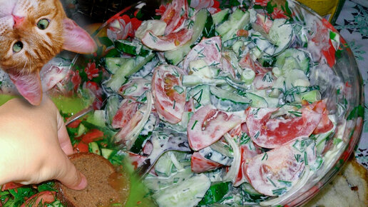 Макать хлебом в жижку – это по-русски. Самый Наш салат: с грядки огурцы, помидорчики и сметана