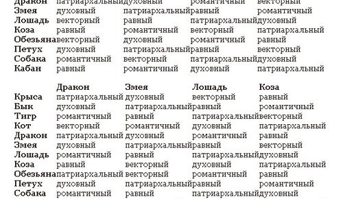 Представляю вашему вниманию типы браков : Патриархальный, Равный, Векторный, Духовный , Романтичный. В таблице представлены, совместимости знаков между собой и к какому они относятся типу. Патриархальный брак - там роли уже поделены, муж добытчик, жена хранительница семьи. Самое главное - дети. А если детей нет, то в отношениях должна присутствовать детская непосредственность. Каждый выполняет свое. Все по честному. Цель тут - дом, хозяйство, дети, сад, огород. Все своими руками. Ощущение внутренней свободы...