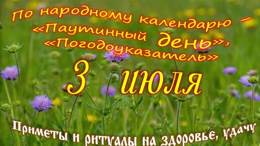 Сегодня 3 июля 2023 года, 184 день 2023 года по григорианскому календарю, 20 июня юлианского календаря (по старому стилю). 15-й лунный день. 16 Солнечный День 4 солнечного месяца очищения источников вод. Приветствую тебя мой гость. Сегодня День недели - понедельник, да не простой, а «Тенетник, паутинный день, погодо -указатель». В народе 3 июля называли паутинный день. Наши предки считали, что в этот день нельзя есть мясо птицы. Пауков тоже лучше не трогать, просто наблюдайте за их паутиной, можно много узнать о погоде на будущее...