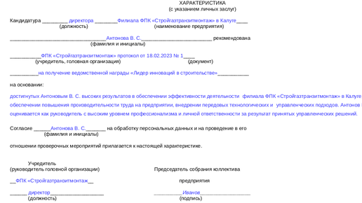 Для чего нужна характеристика на генерального директора с места работы Характеристика на руководителя — документ, который может потребоваться: Если человек руководит ведомственным предприятием, то представление характеристики на него в орган, принимающий решение о награждении, может быть одним из условий выдвижения его кандидатуры на получение ведомственной награды. Узнайте о том, как оформляется решение о назначении директора хозяйственного общества. Например, подобные условия отражены в приказе Министерства строительства и ЖКХ России от 26...