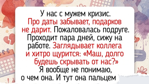 Многие умеют говорить громкие слова, но настоящая забота проявляется в поступках. Герои нашей статьи поделились историями о том, как пришли на помощь своим близким и какие поступки окружающих тронули их больше всего. У нас с мужем кризис в отношениях. Про даты забывает, подарков не дарит. Пожаловалась подруге: «Обидно, у всех мужья стараются, а моему все равно». Она меня успокоила, и я про разговор забыла. Проходит пара дней, сижу на работе. Заглядывает коллега и так хитро щурится: «Маш, долго будешь скрывать от нас?» Я вообще не понимаю, о чем она...