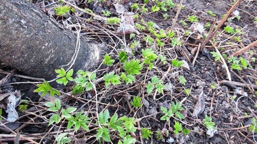 Сныть по сути своей это сорное растение, не смотря на то, что она съедобна и полезна. Вот сейчас у нас снег сошел не больше как неделя, а сныть уже тут как тут, растет себе зеленым ковром под вишнями. Пока она небольшая, но если ее оставить без присмотра, то вырастет на 50 – 60 см в высоту, да еще и зацветет беленькими мелкими цветочками в зонтиках. Цветет сныть начиная с июня месяца и дол середины лета. У себя на участке я не даю сныти цвести, постоянно срубаю ее мотыжкой, приходится за лето срубать несколько раз, а сныть все растет и растет...