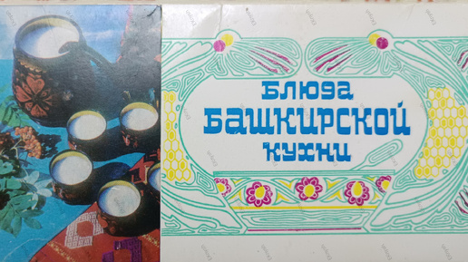 Богато украшенный орнаментом набор открыток с блюдами башкирской кухни. К сожалению, не указана дата выпуска, но думаю, где-то в 80-х. Тираж 30 000 экземпляров, цена 68 коп. Типография издательства Башкирского обкома КПСС. Набор состоит из 15 длинных открыток 9*19 см. На задней стороне обложки выходные данные, на лицевой — блюдо с одной из карточек, и на внутреннем клапане — список рецептов. Открытки состоят как бы из двух частей: на одной — фото, на другой — название. Оборот оформлен также в двух частях: ингредиенты и непосредственно рецепт...