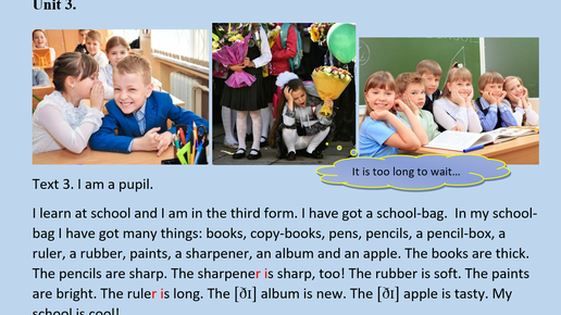 English. Unit 12. Школьные предметы. Окончание множественного числа имен существительных Если мы с вами являемся учениками, то мы должны знать названия предметов, которые нас окружают и которыми мы пользуемся. What is the English for (как будет по-английски): тетрадь, карандаш, линейка, ластик, учебник, точилка, краски, пенал, альбом, яблоко? Сколько баллов из десяти вы набрали? А теперь прочитаем следующий текст и наберем все 10 баллов! Помните! Прежде чем читать текст, нужно ознакомиться со словами, данными ниже, и выучить их наизусть...