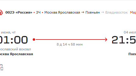 Как было объявлено ранее, в июне 2025 года возобновляются железнодорожные пассажирские перевозки между Пхеньяном и Москвой. Сообщали, что из Пхеньяна – поезда будут отправляться 3-го и 17-го числа с прибытием в Москву 11-го и 25-го числа соответственно, а из Москвы – 12-го и 26-го числа с прибытием Пхеньян 20-го и 4-го числа соответственно. Сегодня, 17 июня, из Пхеньяна должен был выехать первый поезд. Выехал ли? Волнуюсь! Из Москвы первый поезд должен отправиться в четверг, 26 июня. На сайте РЖД билетов на него нет...