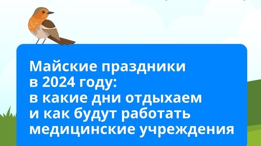 🍃 Майские праздники в 2024 году продлятся 8 дней. Напоминаем, какие дни будут выходными и как будут работать медицинские учреждения. Выходной день с субботы 27 апреля перенесли на 29 апреля, поэтому эта рабочая неделя – шестидневная. Сокращенный рабочий день будет только 8 мая, потому что он предпраздничный.