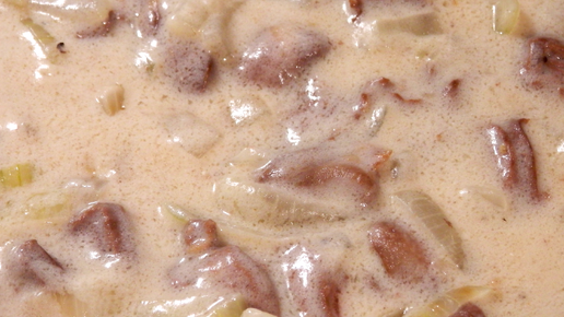 1. Сердечки (400гр.) очищаем от лишнего жира и разрезаем на 2-3 части. 2. Одну большую луковицу режем четверть-кольцами. Слегка обжариваем на сильном огне. 3. Добавляем сердечки и жарим, всё время помешивая, пока они не начнут белеть снаружи. 4. Уменьшаем огонь и всыпаем 1 ст. ложку с горкой муки. Размешиваем. 5. Вливаем в сердечки кипящую воду...