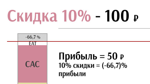 Вот ваш товар. Он стоит 1000 ₽. Его производственная себестоимость или закупочная цена – 400 ₽. Казалось бы, 2.5Х, наценка 150%, есть куда разгуляться со скидками! Теперь сверху накидываем стоимость привлечения клиента. Затраты на рекламу в пересчёте на 1 клиента - 450 ₽. Ваша прибыль 150 ₽. Не сладко, но на потоке жить можно. Так что же для вас значит скидка 10%, каких-то жалких 100 ₽? Это значит, уменьшение вашей прибыли в 3 РАЗА (!) ...или на 67%. 1% скидки = 7% прибыли. Туда же идут скрытые скидки...