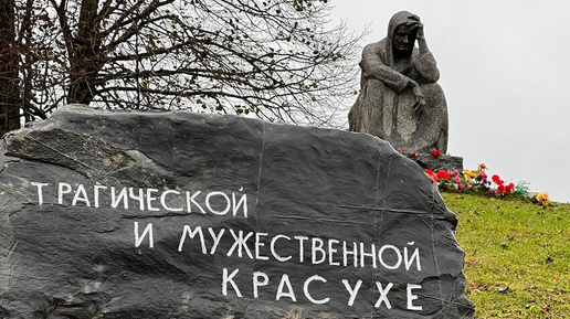 Справа у дороги, на невысоком холме — сидит женщина. Она из камня. Из мёртвого гранита. В глубокой, вселенской скорби она оперлась на руку. На её лице — не слёзы, а тихий, окаменевший ужас. Это не памятник. Это — приговор. Приговор, высеченный в камне всем, кто принёс сюда смерть. Это — «Скорбящая псковитянка». А под ногами у неё — пепел. Пепел деревни Красуха. Источник: pskovkreml60 «Ты взошла на холм, скорбна и грозовита…» Деревня Красуха до войны была цветущей. Участвовала в Сельскохозяйственной выставке в Москве...