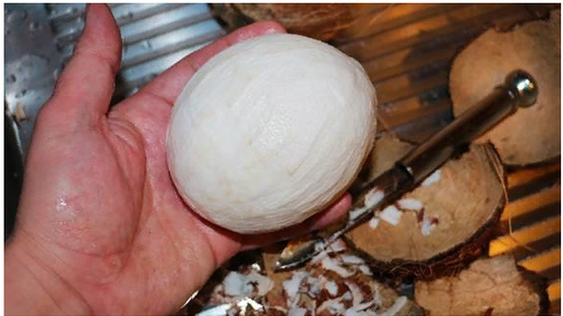 Первый способ очистки Для того чтобы добраться до сердцевины кокоса предстоит расколоть мощную скорлупу. Чистка кокоса в домашних условиях потребует ряда инструментов. Самым подходящим из них может оказаться обычный кухонный инвентарь. В данном примере воспользуемся двумя ножами: крупным для разделки и тонким, хорошо заточенным, с длинным лезвием. В итоге в руках останется то, ради чего все и было затеяно. Мягкая сердцевина, которую можно использовать в качестве ингредиента к различным блюдам или же банально съесть...