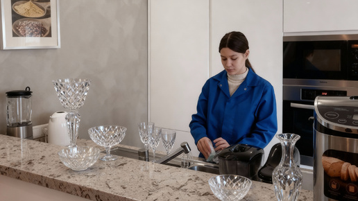 Мыть хрусталь рекомендуется только вручную. Нельзя использовать посудомоечные машины — струи воды и высокие температуры повредят поверхность. Лучше вымыть изделия мягкой губкой или тряпкой из микрофибры для стекла, используя небольшое количество мыла или геля для мытья посуды. После этого прополощите предметы в прохладной воде и вытрите насухо безворсовым полотенцем. Чтобы почистить хрусталь от налёта, желтизны или жировых следов, используйте раствор лимонной кислоты. На литр воды добавьте чайную ложку порошка, перемешайте и погрузите изделия на 20–30 минут...