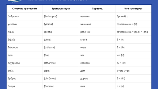 Греческий язык на первый взгляд может показаться сложным — ведь в нём используется свой собственный алфавит. Но на самом деле научиться читать по-гречески можно всего за несколько занятий, если знать основные правила. В этой статье мы разберём: ● греческий алфавит и звуки, ● как читаются гласные и согласные, ● примеры слов с транскрипцией и переводом, ● удобную таблицу для запоминания. Греческий алфавит состоит из 24 букв. Многие из них выглядят знакомо, но читаются иначе. Например: ● Α α – «а» (άνθρωπος...