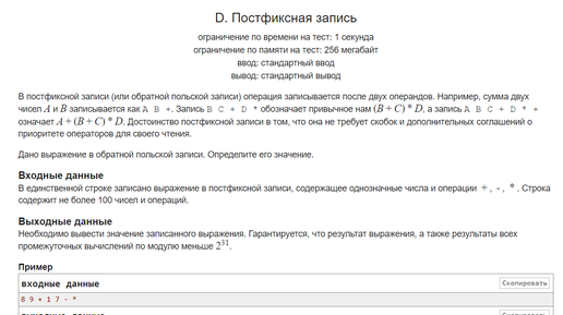 Условие задачи В постфиксной записи (или обратной польской записи) операция записывается после двух операндов. Например, сумма двух чисел A и B записывается как A B +. Запись B C + D * обозначает привычное нам (B + C) * D, а запись A B C + D * + означает A + (B + C) * D. Достоинство постфиксной записи в том, что она не требует скобок и дополнительных соглашений о приоритете операторов для своего чтения. Дано выражение в обратной польской записи. Определите его значение. Алгоритм решения Необходимо грамотно обработать входящую строку...