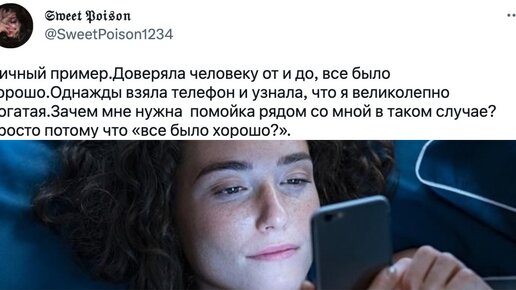 Можно ли читать чужие переписки и проверять телефон мужа или жены? На вопрос отвечают пользователи твиттера. Кто-то кричит о тотальном недоверии и личном пространстве, зато другие знают об изменах. Так проверять в итоге плохо или нет? Давай узнаем о чужом опыте. 1. Доверяй, но проверяй 2. За кем-то был тотальный контроль 3. У кого-то всё общее 4. Личные переписки - это личное 5. Никто не хочет быть обманутым 6...