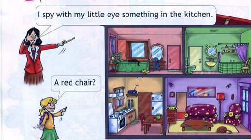 Module 1 — Модуль 1. 1. Давай поиграем. Страница 36 I spy with my little eye something in the kitchen. [Ай спай уиз’ май литл ай самс’ин: ин з’э китчен] — Я что-то вижу на кухне. A red chair? — [Э рэд чиа?] — Красный стул?