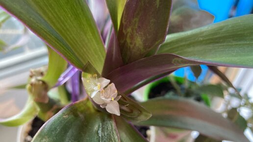 Недавно у нас зацвела традесканция рео. Несколько дней мы утром видели начало цветения, а вечером уже только опавшие бутончики. Просили даже детей сфотографировать, но повезло увидеть своими глазами на выходных. Рео очень красив и без цветов, мощные листья. С одной стороны сочного зеленого цвета, а с нижней стороны насыщенного фиолетового. Правда на фото видно, что листья немного повреждены. Я предполагаю, что это из-за того что он постоял на солнце. Сейчас с прямых солнечных лучей убрали и он как раз зацвел...