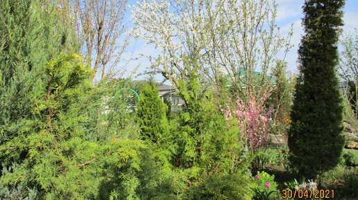 Продолжу рассказывать о цветении фруктовых деревьев в моём саду. Всё растёт вместе и нет деления на сад, огород, цветник и хвойные посадки. Некоторые избегают в саду сажать хвойные из за того, что они плохо влияют на фруктовые деревья. Я об этом никогда не задумывалась и не знала таких правил. Просто сажала всё так, как мне нравилось. Мне и сейчас нравится мой сад. Фруктов нам вполне хватает, да и проблема ещё в том, что никто их есть не хочет. Пока всё свежее с веток, ещё едим, и потом....страшно сказать...