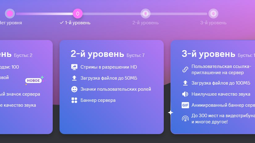 Разные уровни - разные привилегии Вы могли заметить, что Discord при попытке дать своему серверу буст рассказывает нам о том, какие же именно привилегии мы получим при достижении того или иного уровня. Давайте рассмотрим каждый: