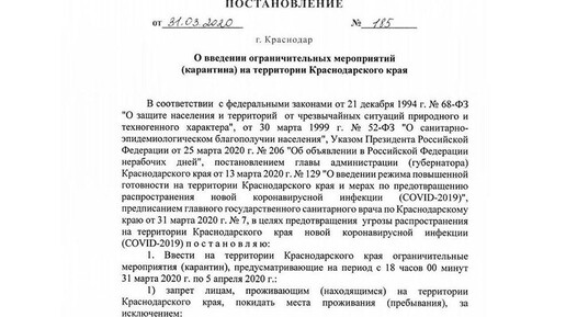 Как сообщает интернет-портал «Кубань 24» в Краснодарском крае объявлен карантин. По предварительной информации, он продлиться до 5 апреля. В случае необходимости он может быть продлен. Разъяснения по вопросу введения карантина на территории Краснодарского края: