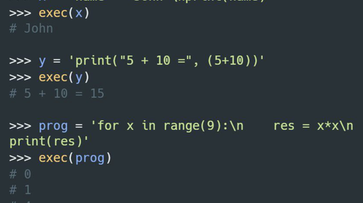Функция exec() поддерживает динамическое выполнение кода Python и принимает большие блоки кода, в отличие от eval(). Передаваемый функции код должен быть либо строкой, либо объектом кода, например сгенерированный функцией compile(). Если это строка, строка анализируется как набор операторов Python, который затем выполняется (если не возникает синтаксическая ошибка). Если это объект кода, он просто выполняется. Во всех случаях ожидается, что исполняемый код будет действительным, как ввод файла. Во всех случаях, если globals и locals опущены, код выполняется в текущей области видимости...