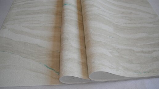 Несколько лет назад в одной компании на строительной выставке взял образцы так называемого гибкого камня. Это мелкий кварцевый или мраморный песок со связующим. Как правило, используют акриловые полимеры. Благодаря их свойствам, материал получается гибким. А при использовании различных красителей, пигментов, можно создать рисунок, имитирующий мрамор или гранит. На моих фотографиях представлены элементы из заколлерованного в разные цвета кварцевого песка. И по строению плиток видно, что песчинки скреплены полимером без сетки...