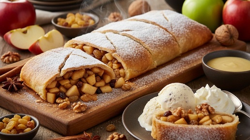 Осенью яблоки сами просятся в выпечку — ароматные, сладкие, доступные. И если выбирать один «обязательный» десерт сезона, для меня это яблочный штрудель: тонкое хрустящее тесто, внутри — сочные яблоки с корицей, орешками и легкой карамельной кислинкой. Готовится он удивительно просто и подходит даже тем, кто «не дружит» с дрожжами: всё делаем в домашних условиях, в обычной духовке, за короткое время. Получается нарядно, вкусно и очень по-семейному — как раз к чаю, на завтрак или на праздничный стол...