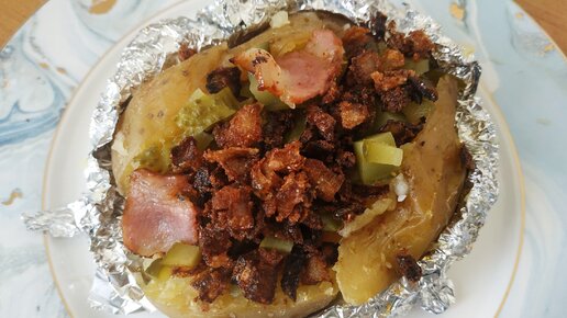 Предыстория. Первый и последний раз, когда я была в популярном фастфуде "Крошка-картошка" я осталась ужасно недовольна. Попробовав их блюда, в голове сразу появились вопросы: "Как это можно есть?"и "Почему это так не вкусно?". Картошка была совершенно сухой, невкусной, как-будто она и начинки лежали там несколько дней, перед тем как я их попробовала. Желание сходить туда повторно - отпало. Однако мне все равно хотелось попробовать это интересное блюдо, и я решила приготовить его сама. Ведь, как оказалось, это очень просто!!! P...