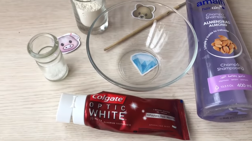 Всем привет сегодня я покажу вам как сделать такой слайм без клея в домашних условиях с использованием подручных средств, а именно сахара и шампуня Ну что ж начнем, и для того чтобы сделать лизуна нам понадобится любая зубная паста, шампунь, сахар и если у нас это все будет липнуть к рукам то мы добавим муку или крахмал Отправляем зубную пасту в емкость у меня она что-то трудно выдавливалась но я справилась) Сейчас мы добавляем шампунь и теперь все перемешиваем у меня сам по себе жидкий шампунь и посмотрим что из этого выйдет...