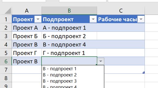 Предположим, у вас в таблице есть проекты и подпроекты, и вы хотите сделать выпадающий список, в котором подпроекты показываются только для выбранного проекта. Показываю, как легко и быстро сделать зависимые «выпадайки». Готовим списки Создадим лист "Списки", в котором укажем проекты и подпроекты. Проекты перечислим в строке 2. Подпроекты – в стоблик под каждым проектом. Строку 1 оставим для служебных формул, которые будут указывать диапазон, в котором перечислены подпроекты. Формула в строке 1 (формула...