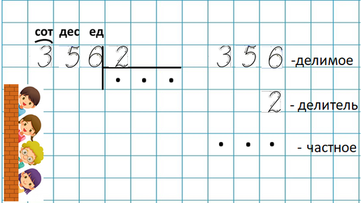 При решении примеров на деление столбиком многозначного числа на однозначное, необходимо следовать правильному порядку в решении и записи. Давайте с Вами рассмотрим: Находим первое неполное делимое Делим 356 на 2. 356 - делимое, 2 - делитель, ответ - частное. Определяем первое неполное делимое (наименьшее число, которое делится на делитель - 2) Делим сотни Делим десятки к 1 сот...