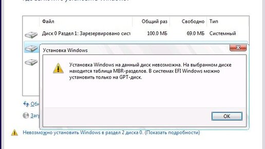 "Установка Windows невозможна, так как диск имеет стиль разделов MBR/GPT" - как решить проблему?
